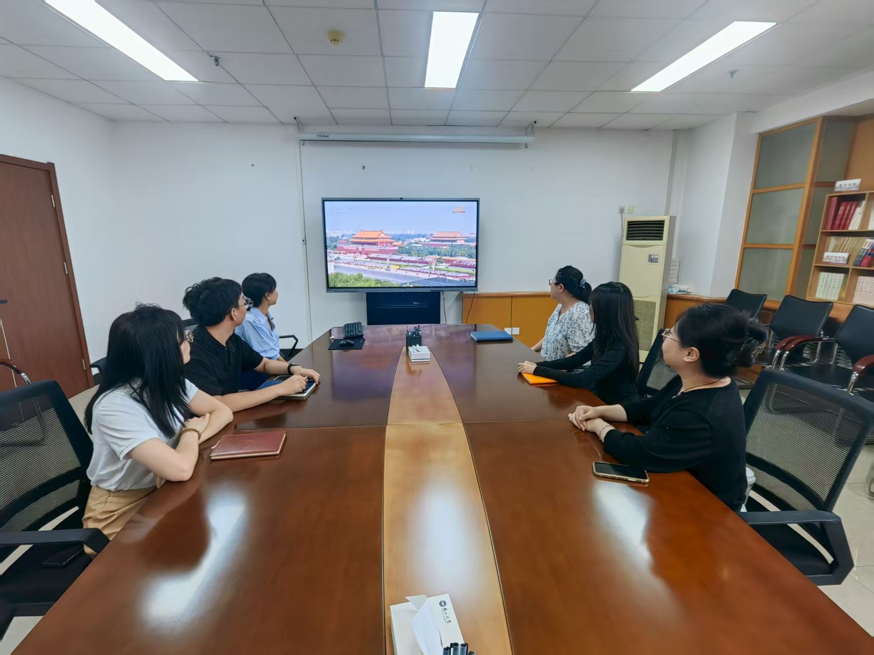9月3日上午8:40,党委宣传部党支部组织党员观看了中国人民抗日战争暨世界反法西斯战争胜利80周年纪念大会。除2名部门负责人在主会场观看直播、1人因工作安排承担拍摄任务、2人在其他直播会场担任工作人员外,其余7名党员在世纪楼2003会议室集中就座,满怀期待地静候大会直播开始。